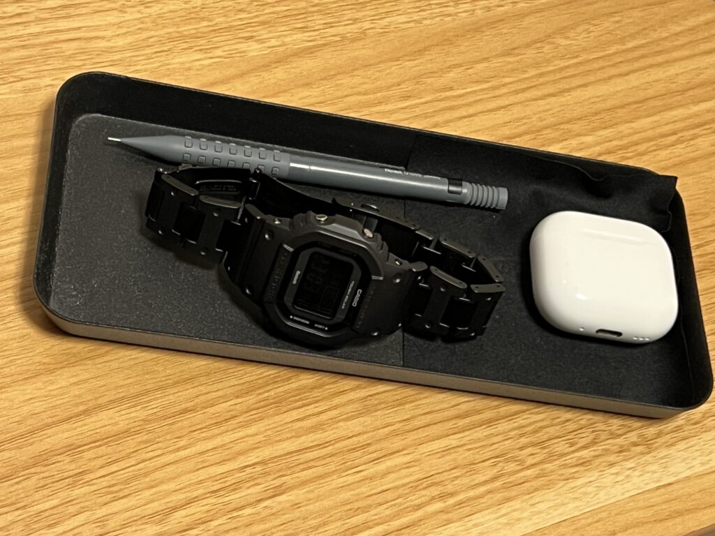 愛用しているグレーのシャーペン(Pentel スマッシュ)や、シンプルなAirPodsと一緒にトレイに置いたときの統一感が最高です。